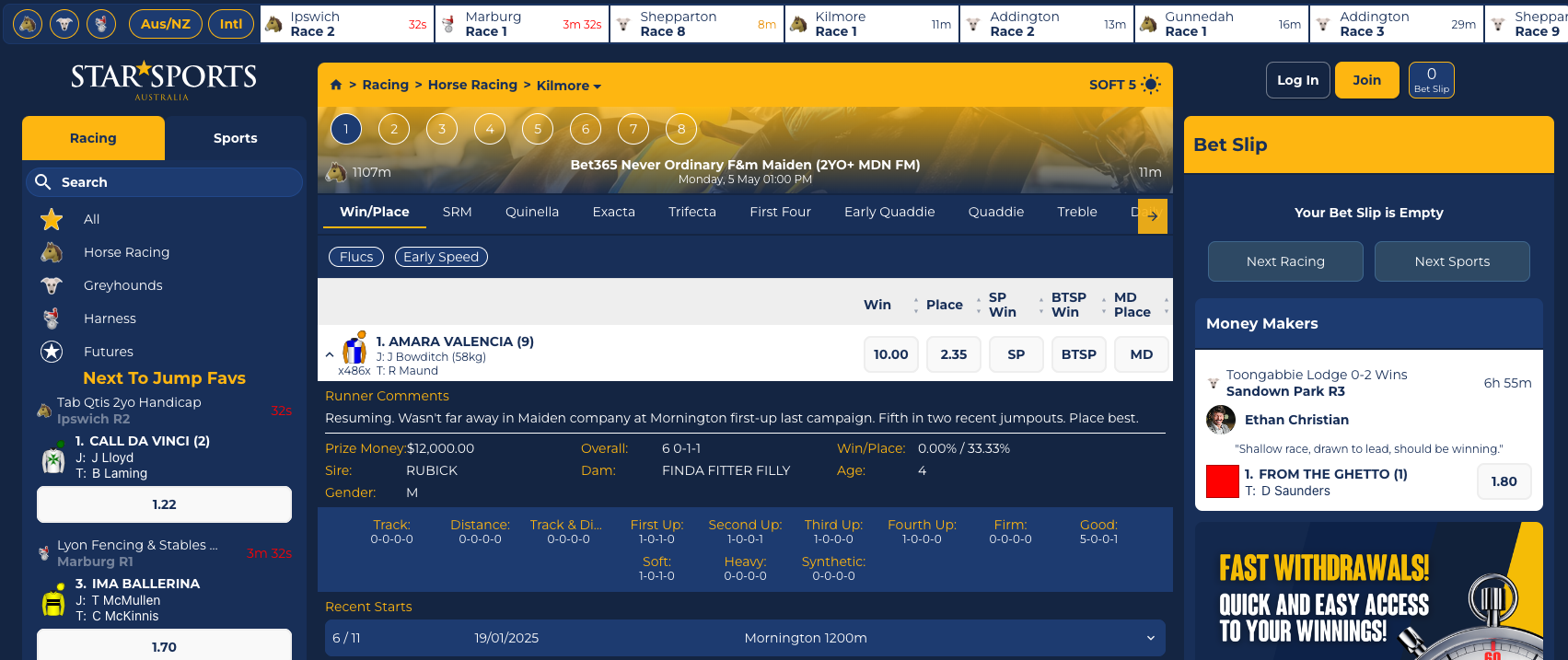 Easy to filter race meetings, add selections, and build bets. The slip is fast and responsive.